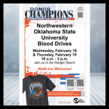 ALVA, Okla. — Northwestern Oklahoma State University’s Business Club, Pre-Nursing Association and Student Nurses Association will partner with Our Blood Institute to host the “Donor Champions” blood drive from 10 a.m. to 3 p.m. on Wednesday, Feb. 18, and Thursday, Feb. 19, in the Student Center Ranger Room on the Alva campus.