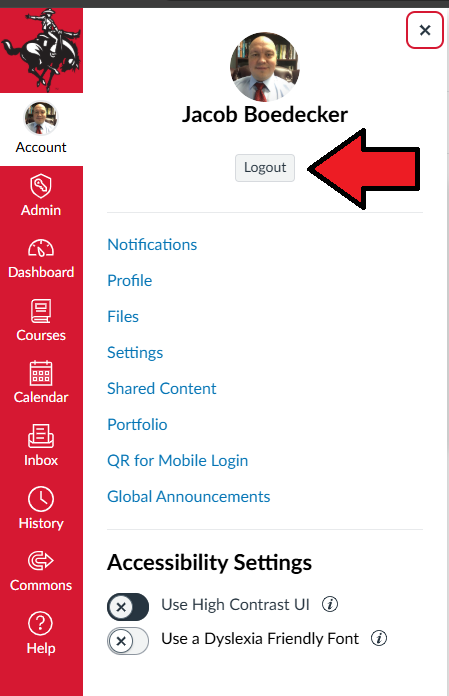 If you are using a lab computer or a shared computer, make sure you sign out when you are finished working in Canvas. To logout, expand the "Account" area in the left navigation panel and click "Logout."