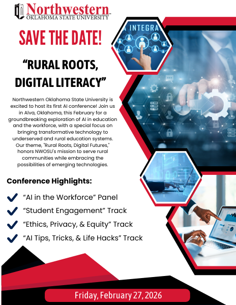 An exploration of AI in education and the workforce, with a special focus on bringing transformative technology to underserved and rural education systems, Student Center Ballroom & Ranger Room. Open to P-12 teachers, higher education faculty and students, and those who support faculty in teaching. Free, but registration is required.
