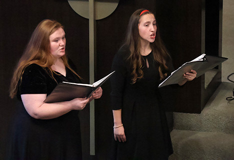 Members of the University Singers – biology majors Rylee Ott, Forgan junior, and Jenna Johnson, Mustang freshman -- perform at the Alva First Presbyterian Church in March 2026. The last concert of the season is on May 1 at 7 p.m. at the church location.